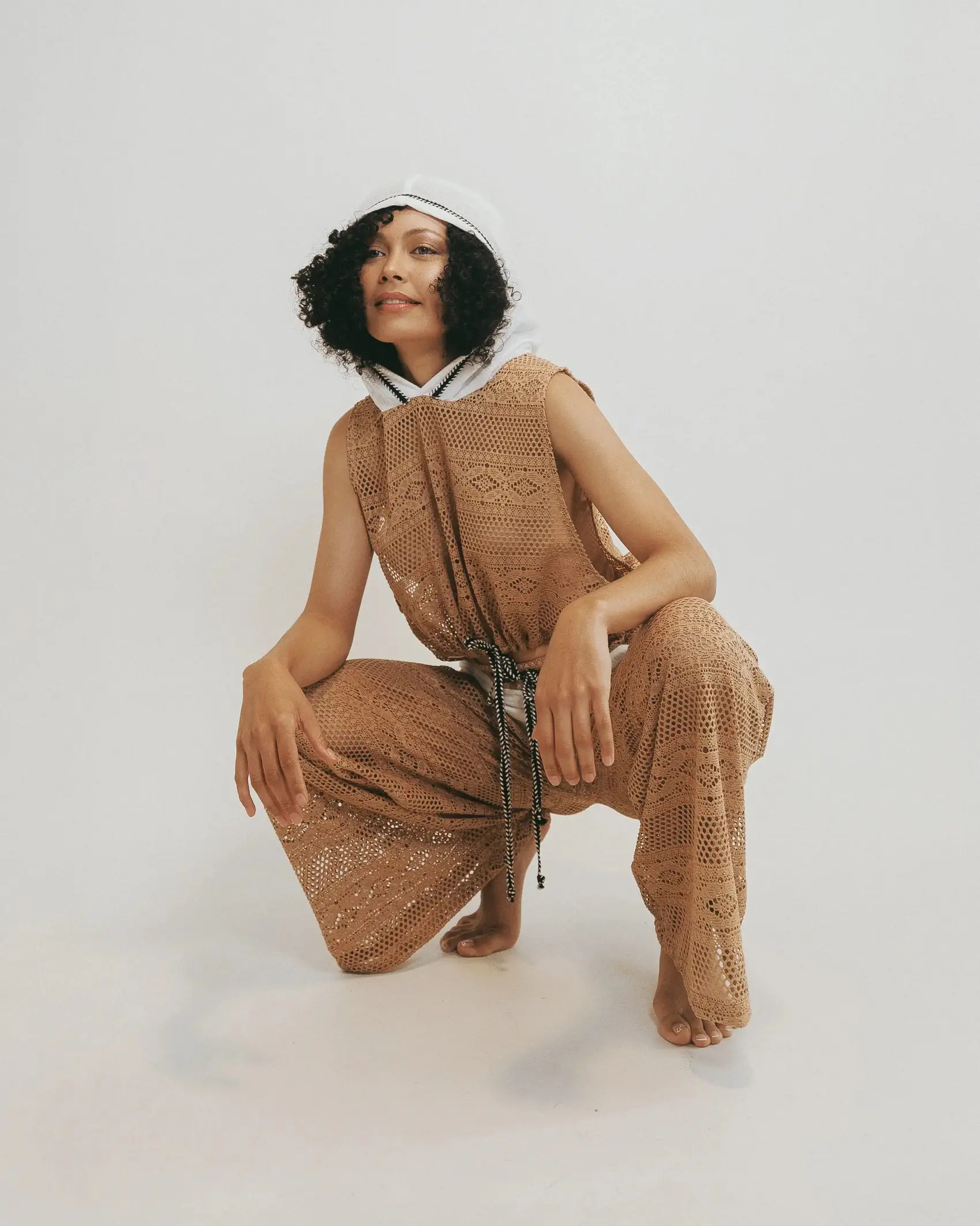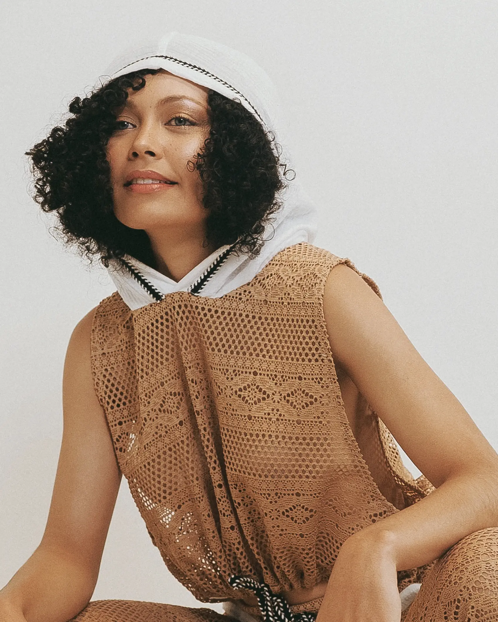 Blusa corta por amarre en hiladillo, manga sisa profunda y capota en algodón.