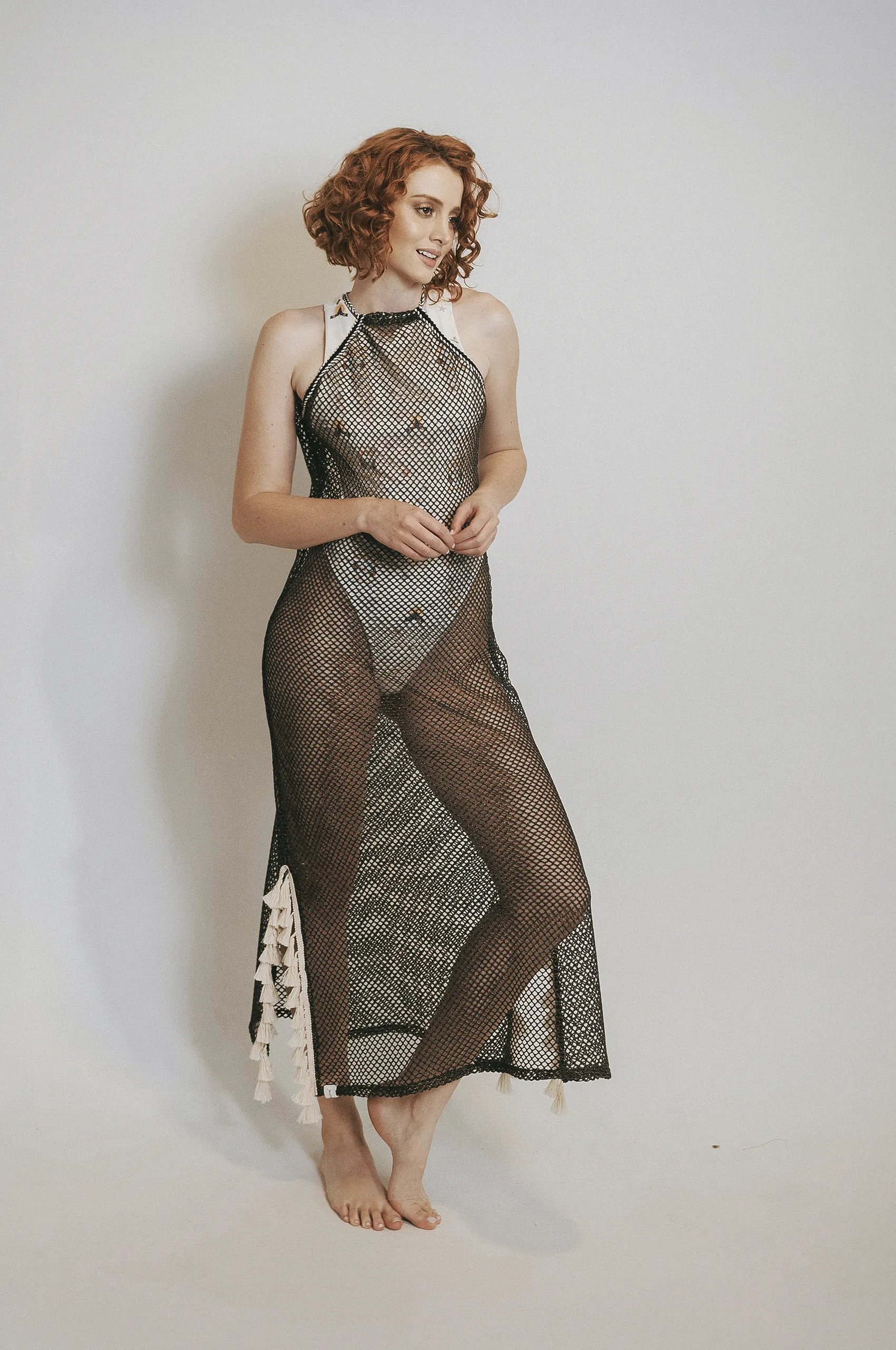 Salida de baño tipo vestido Halter en malla con brillo sutil, y fleco de algodón orgánico.