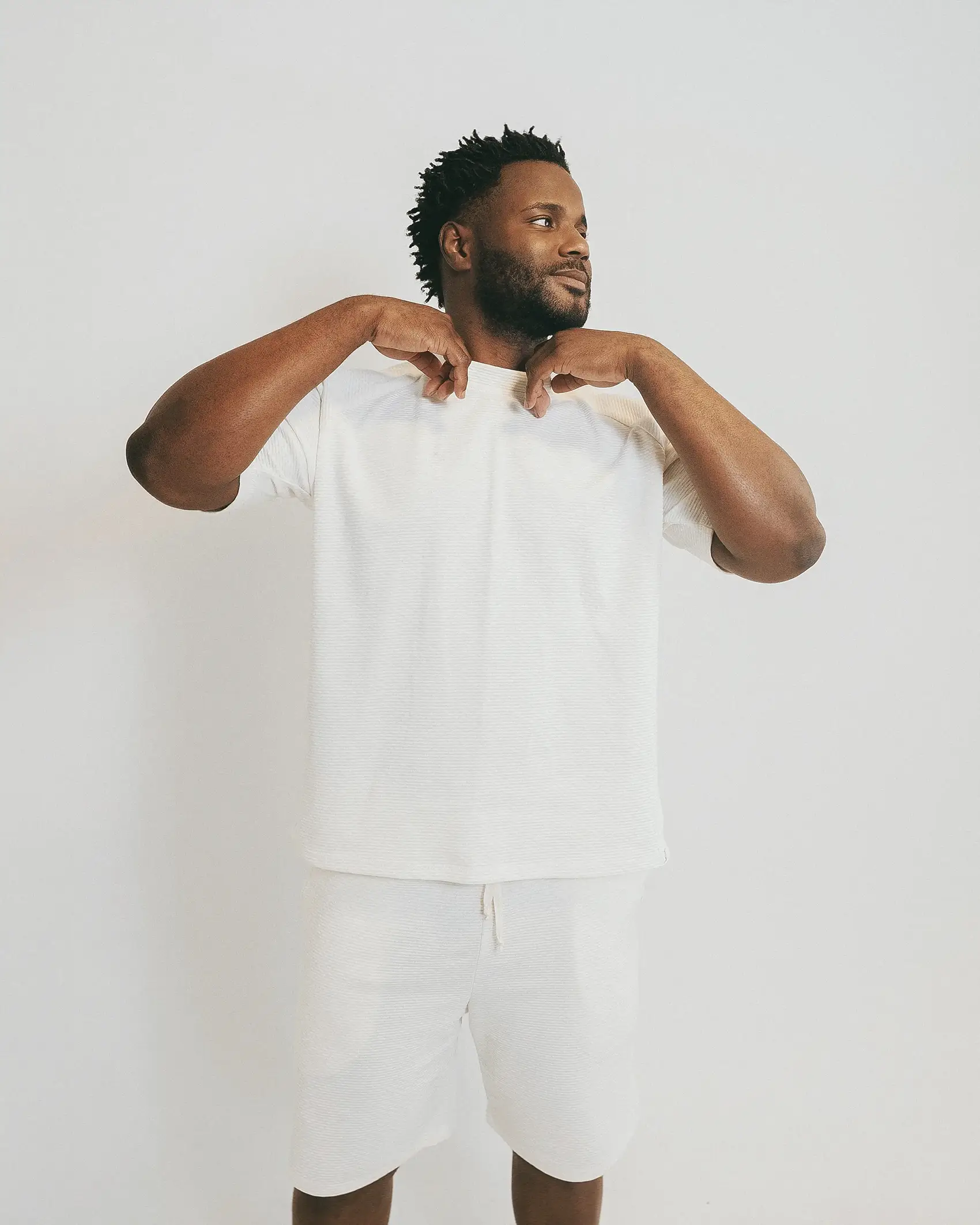 Confy Set Masculino de camiseta manga corta y cuello redondo alto y bermuda con pretina ajustable.