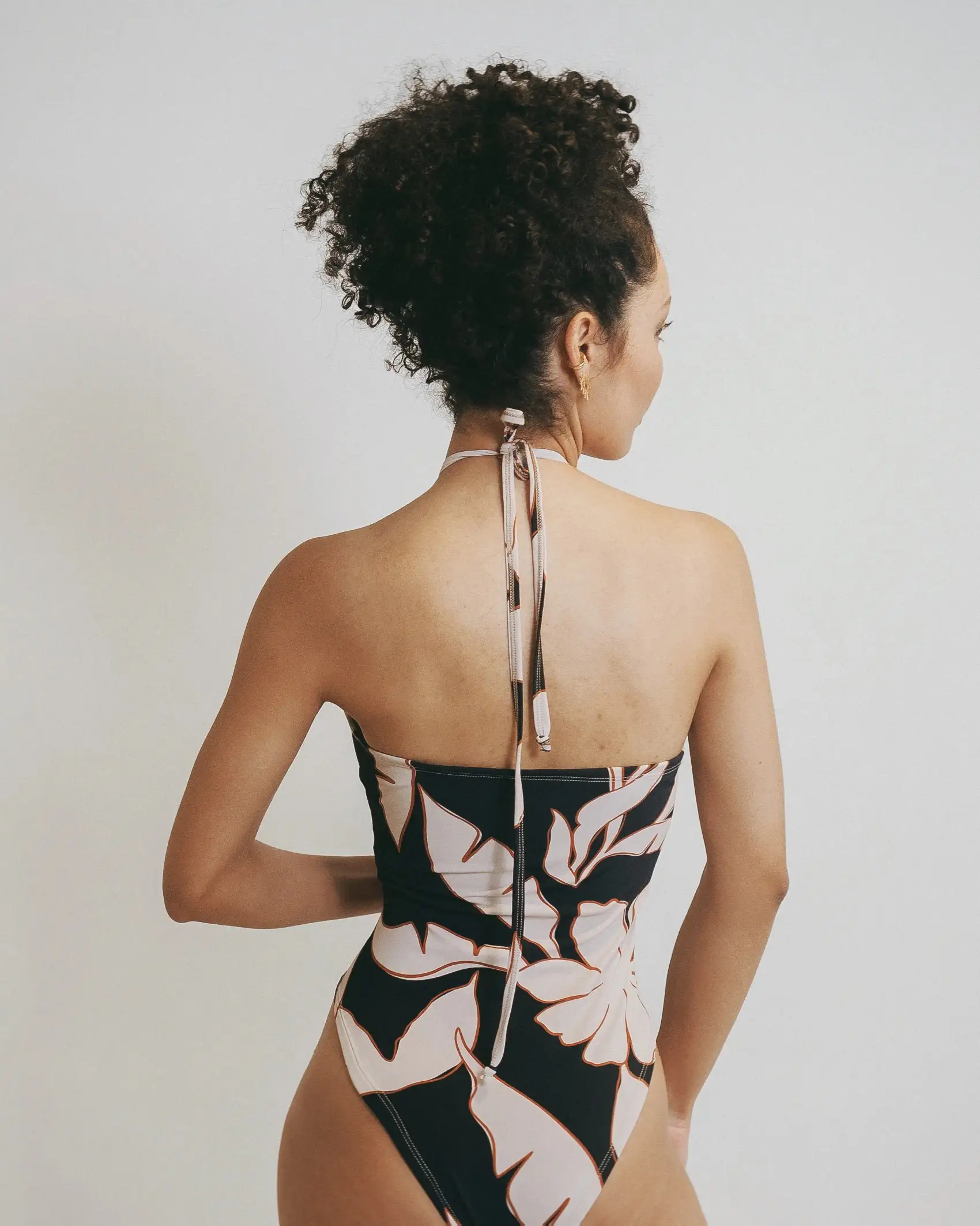 Traje de baño enterizo con escote estraple de amarre halter, tiro alto.